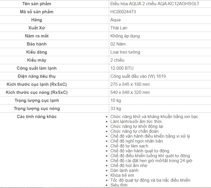 Điều hòa AQUA 2 chiều AQA-KC12AGHSGLT là chiếc điều hòa hai chiều đến từ một trong những thương hiệu nổi tiếng và phổ biến nhất từ Nhật Bản nhưng lại sở hữu mức giá hấp dẫn khi so sánh với các điều hòa 2 chiều khác cùng phân khúc. Bên cạnh đó, máy còn sỡ hữu thiết kế tối giản mà tinh tế đi cùng tông màu trắng hiện đại.