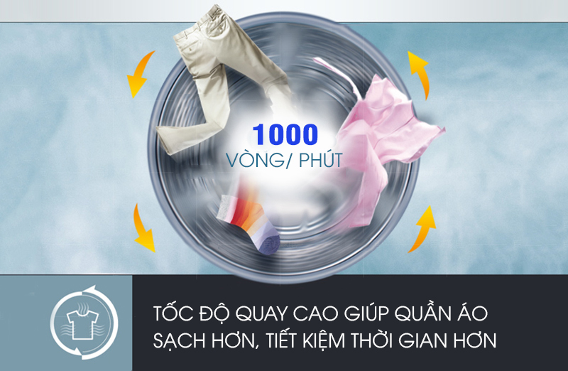 Với tốc độ quay vắt 1000 vòng/1 phút giúp cho việc giặt sạch và làm khô quần áo một cách nhanh chóng, tiết kiệm thời gian mà quần áo vẫn luôn được giặt sạch sẽ.